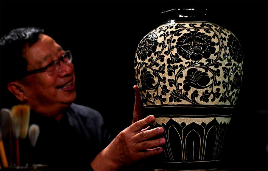 Liu Lizhong looks at his Cizhou Kiln work at a museum in Handan city, North China's Hebei province, Sept 12, 2019. [Photo/Xinhua]