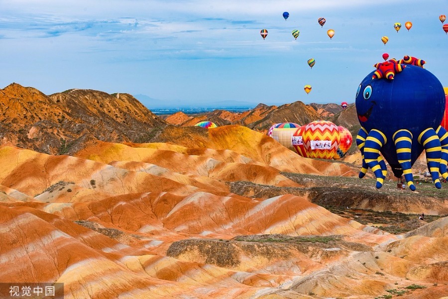 Hot air balloons glide across the Danxia landform during the first hot air balloon festival in Zhangye, Northwest China's Gansu province, July 20, 2019. The unique Danxia landform in Zhangye features multicolored ridges of weathered strata. Visitors can not only marvel at the natural wonders here, but also can try hot air balloons, helicopters and powered parachutes.[Photo/VCG]