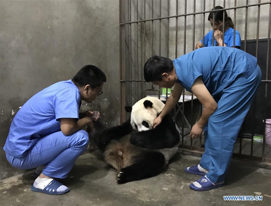 Staff members of the Qinling Research Base of Giant Panda Breeding of Shaanxi Academy of Forestry check the breastfeeding situation of giant panda Lousheng in Xi'an, northwest China's Shaanxi province, Aug 27, 2019. Giant panda Lousheng has given birth to one cub recently, which is the third giant panda cub born in Shaanxi this year. [Photo/Xinhua]
