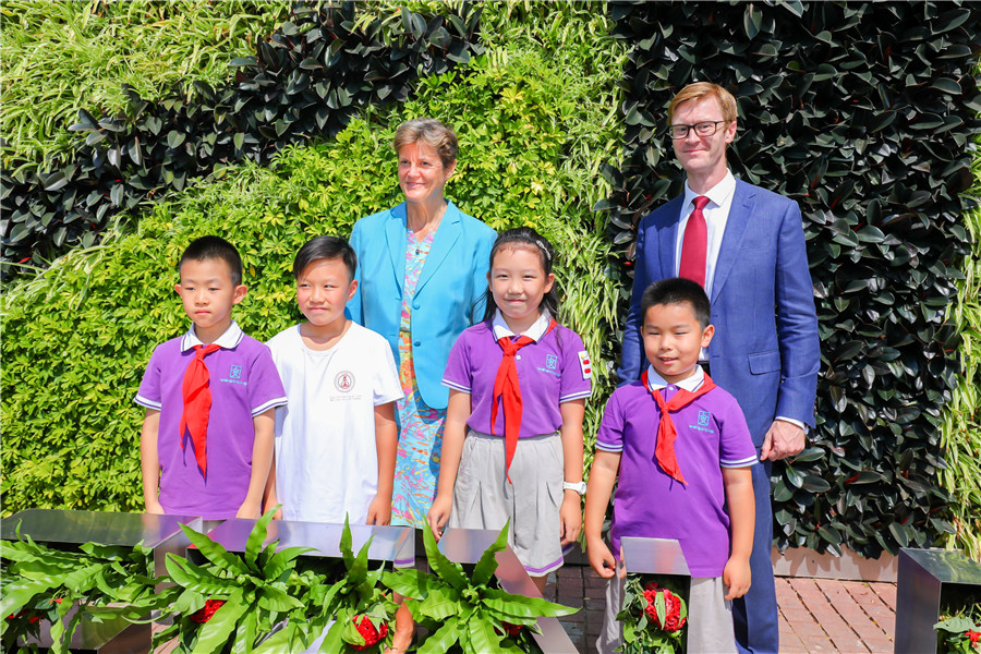 Students from the AY Academy participate in a tree-plating activity with Barbara Woodward (left), the UK ambassador to China, on Sept 17, 2019. [Photo provided to chinadaily.com.cn]