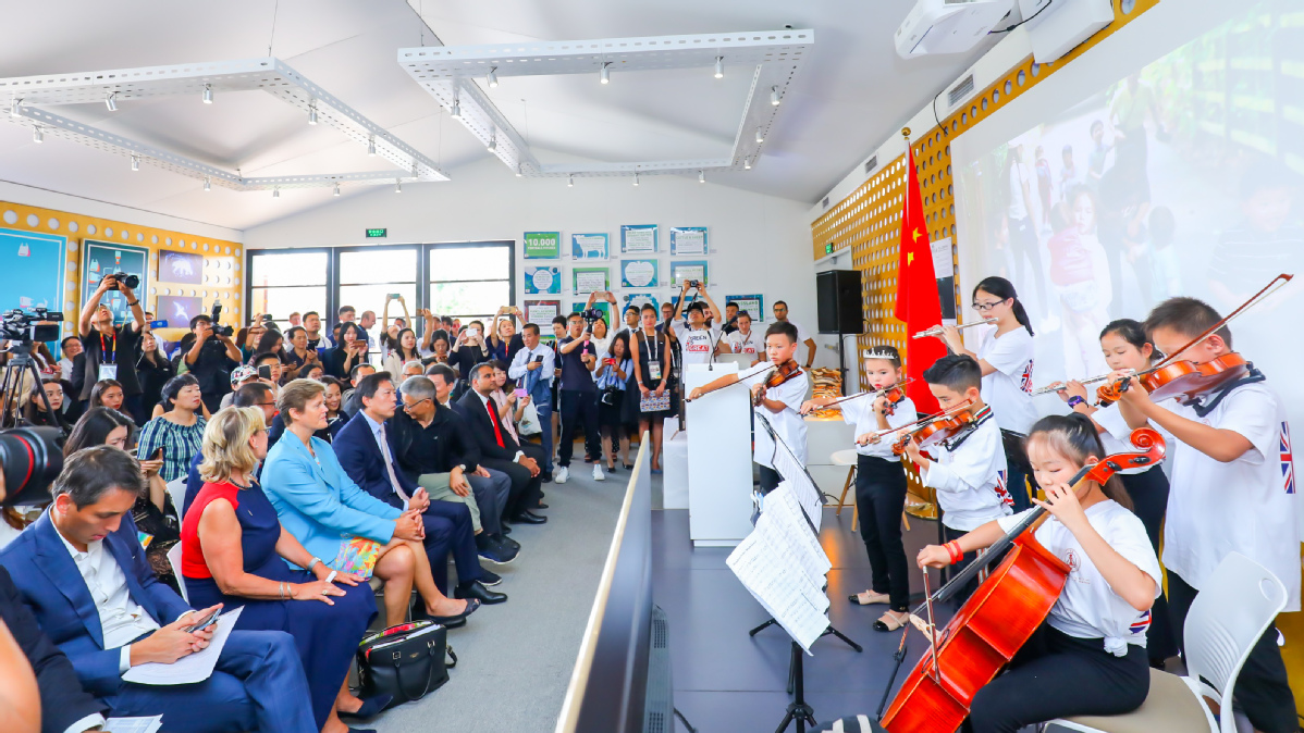 Students from the AY Academy give music performance during the opening ceremony of the UK Day, at the 2019 Beijing International Horticultural Exhibition, on Sept 17, 2019. [Photo provided to chinadaily.com.cn]
