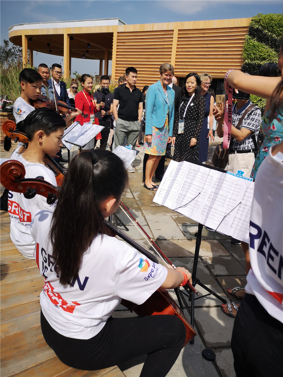 Amy Yuan, founder of the AY Academy, converses with Barbara Woodward, the UK ambassador to China, about life and work at the academy, during the National Day of the United Kingdom event at the 2019 Beijing International Horticultural Exhibition, on Sept 17, 2019. [Photo provided to chinadaily.com.cn]