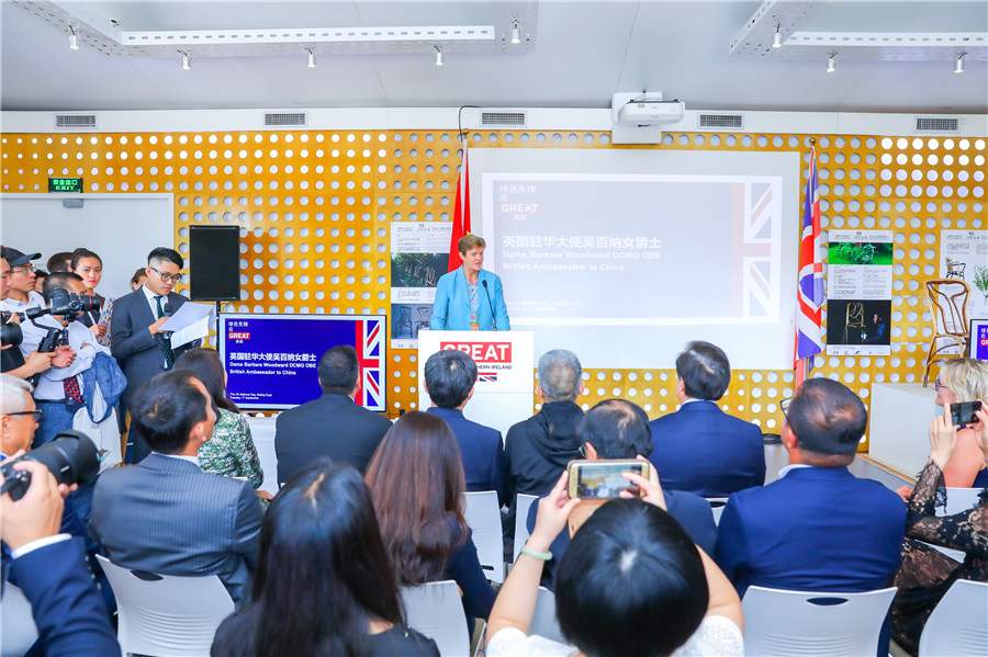 Barbara Woodward, the UK ambassador to China, addresses guests at the the opening ceremony of the National Day of the United Kingdom event, at the 2019 Beijing International Horticultural Exhibition, on Sept 17, 2019. [Photo provided to chinadaily.com.cn]