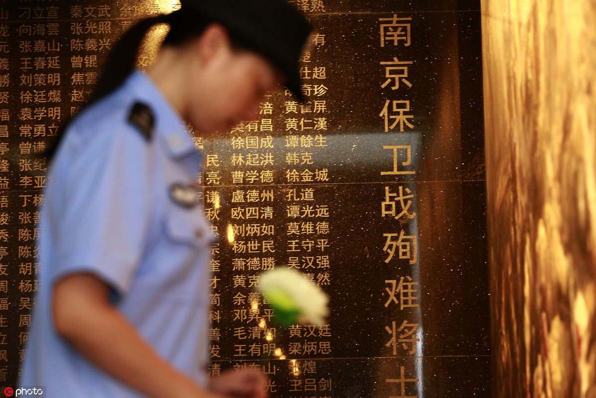 An officer presents a flower to the war martyrs at the Nanjing Folk Anti-Japanese War Museum, on Sept 17, 2019. [Photo/IC]