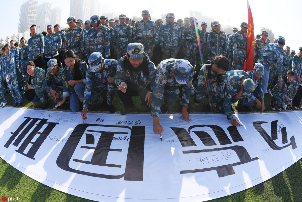 Students at Bozhou Vocational and Technical College sign their names on a banner during a commemoration event in East China’s Anhui province, on Sept 18, 2019. [Photo/IC]