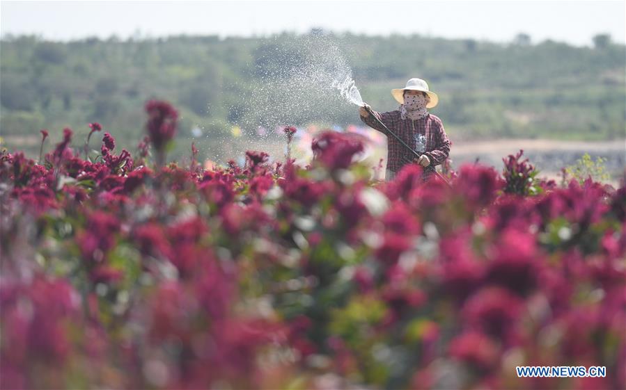 A farmer waters at the planting fields of traditional Chinese herbal medicine in a valley in Neiqiu County, north China's Hebei Province, Sept. 21, 2019 In recent years, Neiqiu County has taken advantage of its landform to develop planting of traditional Chinese herbal medicine, which has largely increased the income of local farmers. (Xinhua/Zhu Xudong)