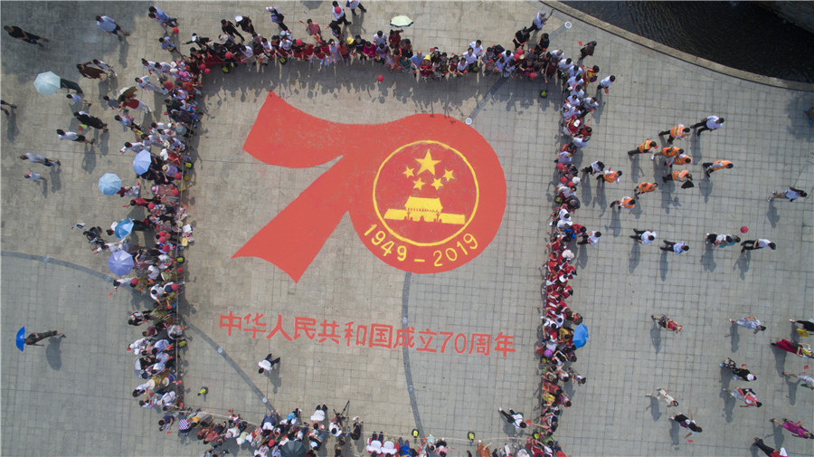 A flash mob gathers around a giant sand painting at the Taohualing scenic spot in Changsha, Central China's Hunan province, on Sept 15, 2019 to celebrate the 70th anniversary of the founding of the People's Republic of China. [Photo by Wang Jing and Liu Qing/chinadaily.com.cn]