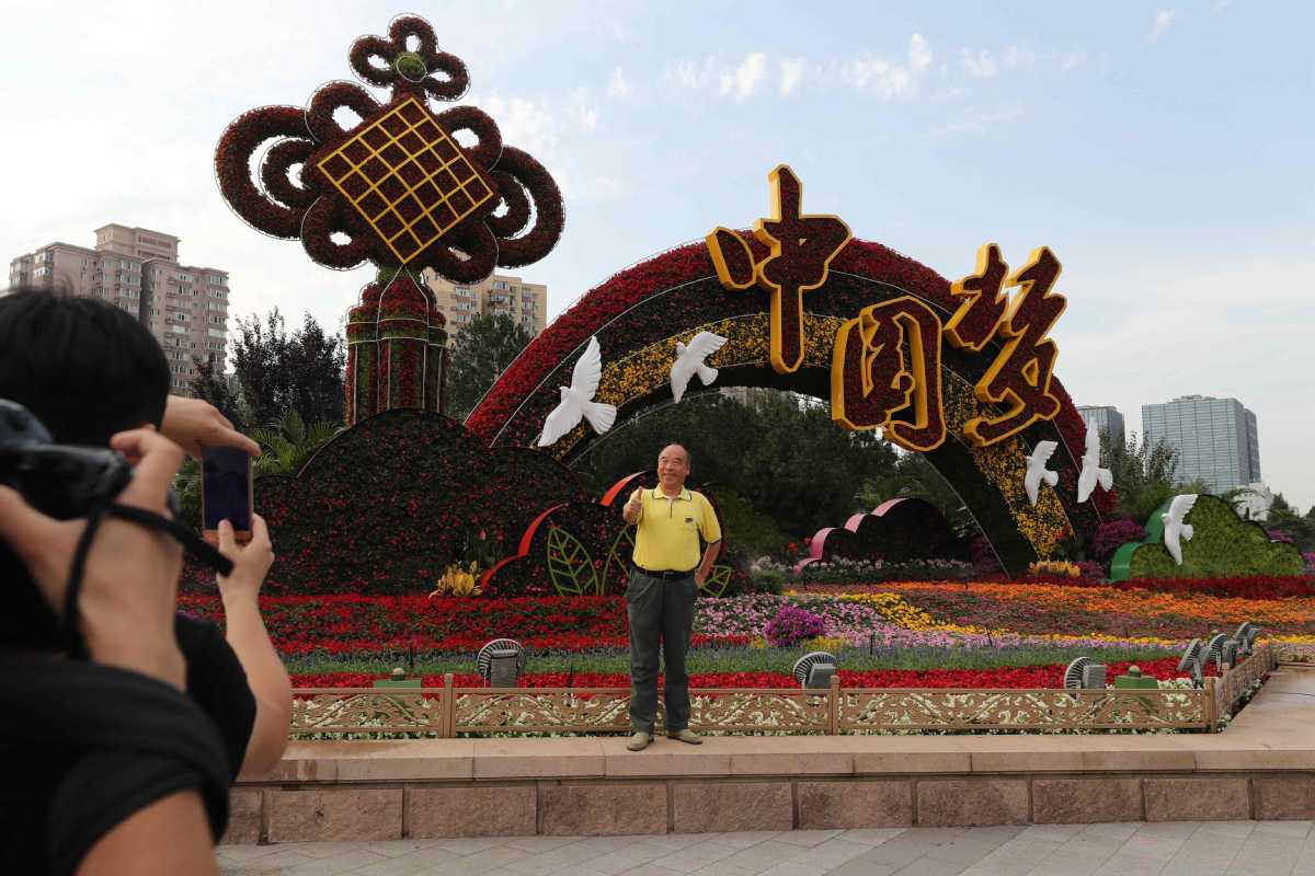 A man poses for a photo with a flowerbed themed "wonderful tomorrow" at the northeast corner of Fuxingmen, Beijing, Sept 20. [Photo by Wang Jing/chinadaily.com.cn]