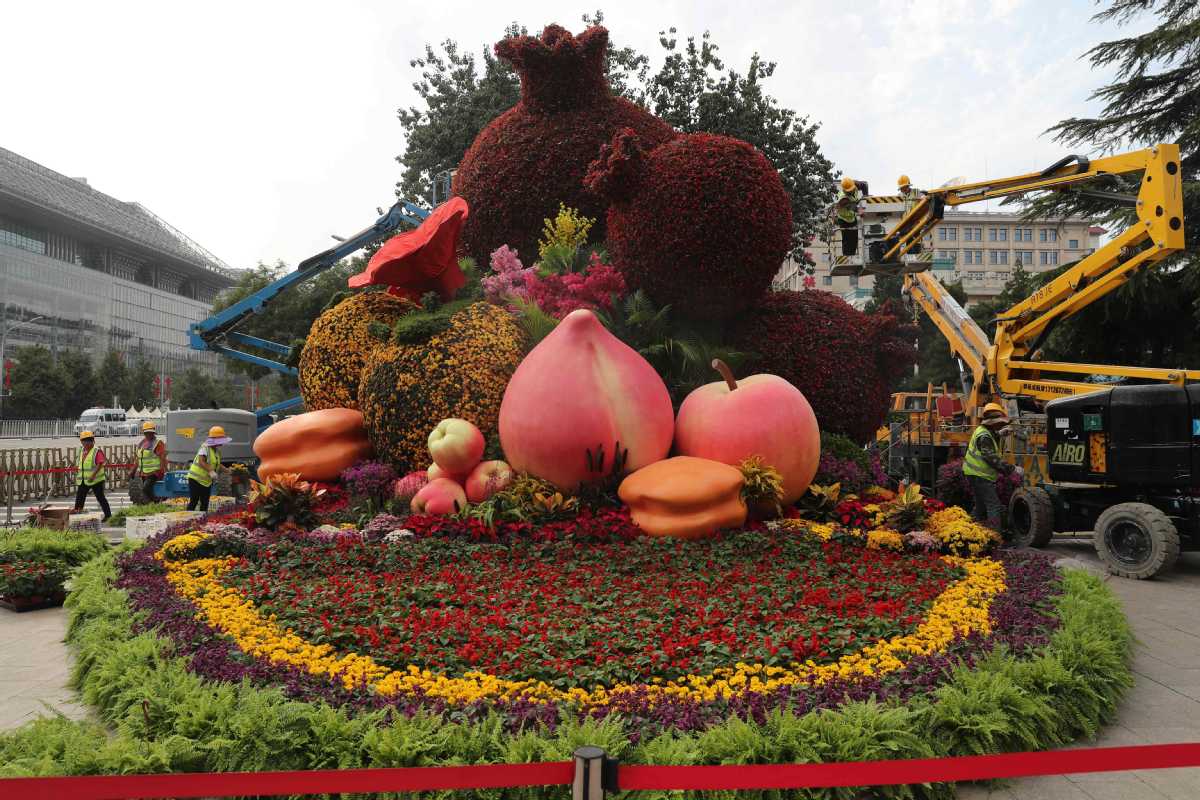 Workers arrange the flower bed "Ethnic unity" near the Cultural Palace of Nationalities in Beijing, Sept 20. [Photo by Wang Jing/chinadaily.com.cn]
