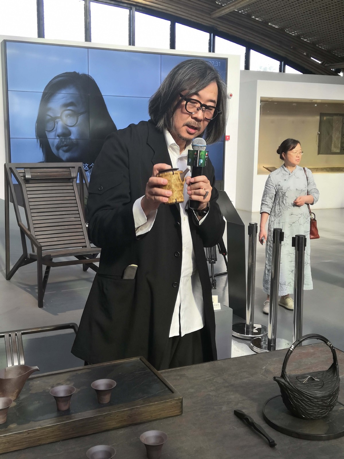 Jeff Shi Dayu shows a new artifact he has designed. [Photo by Liu Lanying/for Chinadaily.com.cn]