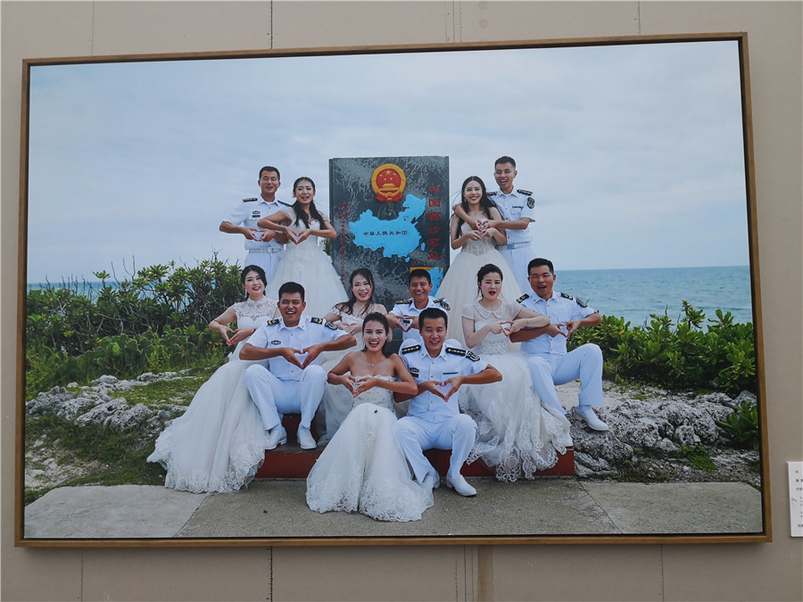Bridal couples posed in a coastal setting are pictured in one of the 70 group photos shown in a feature exhibition to mark the PRC's 70th anniversary at the 19th Pingyao International Photography Festival, on Sept 19, 2019. [Photo by Sun Ruisheng/chinadaily.com.cn]
