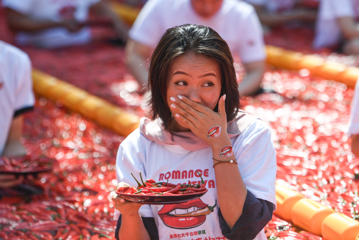 A chili eating competition was held in Hangzhou, east China's Zhejiang on Sept. 22. About 100 contestants took part in the competition. A contestant from Henan won the game by eating 27 chili peppers in 1 minute.