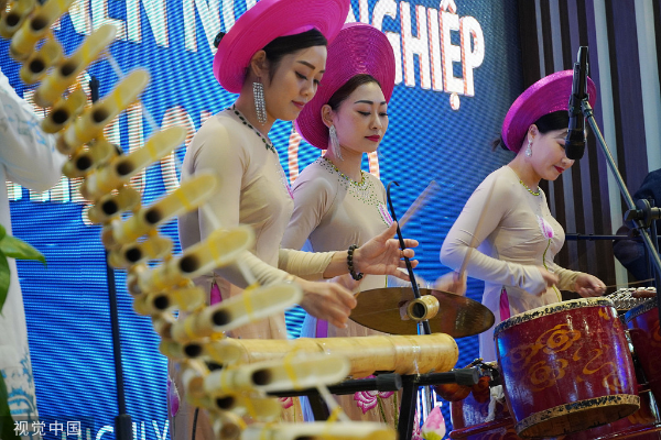 Performers from Vietnam entertain visitors and buyers at the Vietnam's booth at the 16th China-ASEAN expo in Nanning, on Sept 21, 2019. [Photo/VCG]