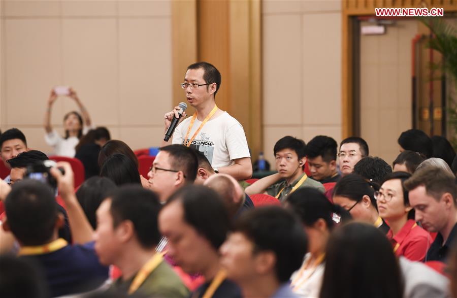 A journalist asks questions during a group interview of the press center for the celebration of the 70th anniversary of the founding of the People's Republic of China in Beijing, capital of China, Sept. 24, 2019. (Xinhua/Wang Quanchao)