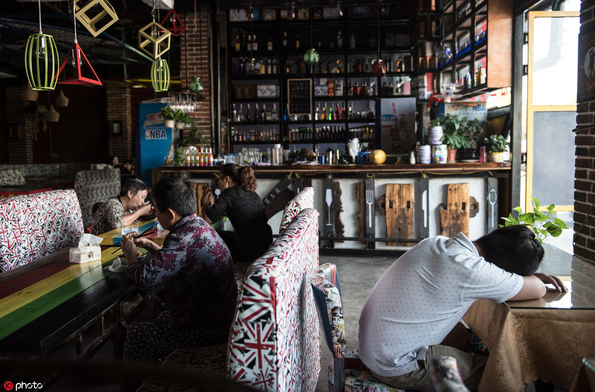 Shen Xilai takes a nap at his bar in Nanchang, East China's Jiangxi province, on Sept 18, 2019. [Photo/IC]
