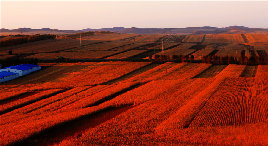 Fiery red grasslands are seen in the Hulunbuir Prairie in North China's Inner Mongolia autonomous region in September. [Photo by Jiang Xiwu/for chinadaily.com.cn]