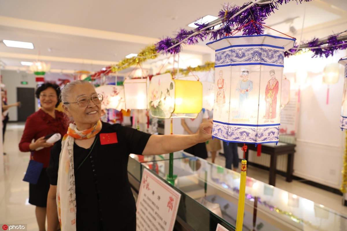 A lantern-maker introduces her handicrafts at a traditional Chinese lantern exhibition in the Yayuncun subdistrict cultural center, Chaoyang district, in Beijing, on Sept 24, 2019. [Photo/IC]