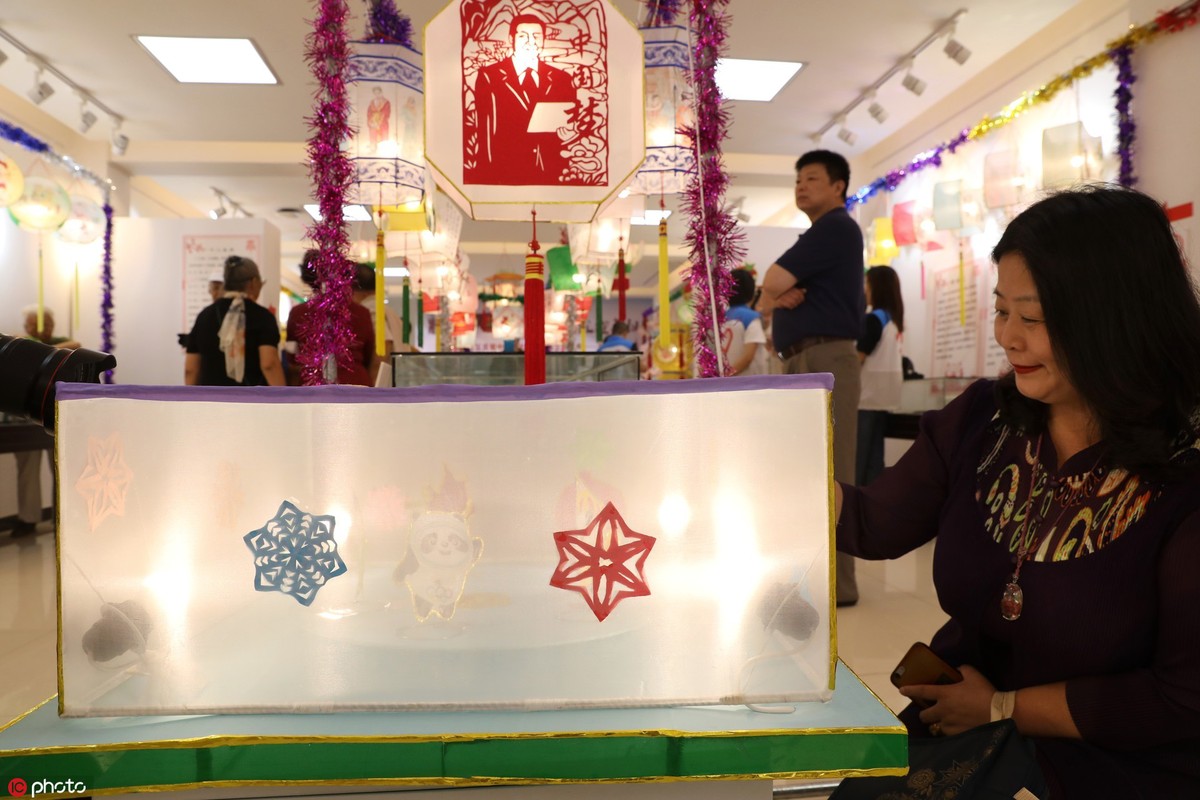 A visitor views a 2022 Beijing Winter Olympics-themed lantern at a traditional Chinese lantern exhibition in the Yayuncun subdistrict cultural center, Chaoyang district, in Beijing, on Sept 24, 2019. [Photo/IC]
