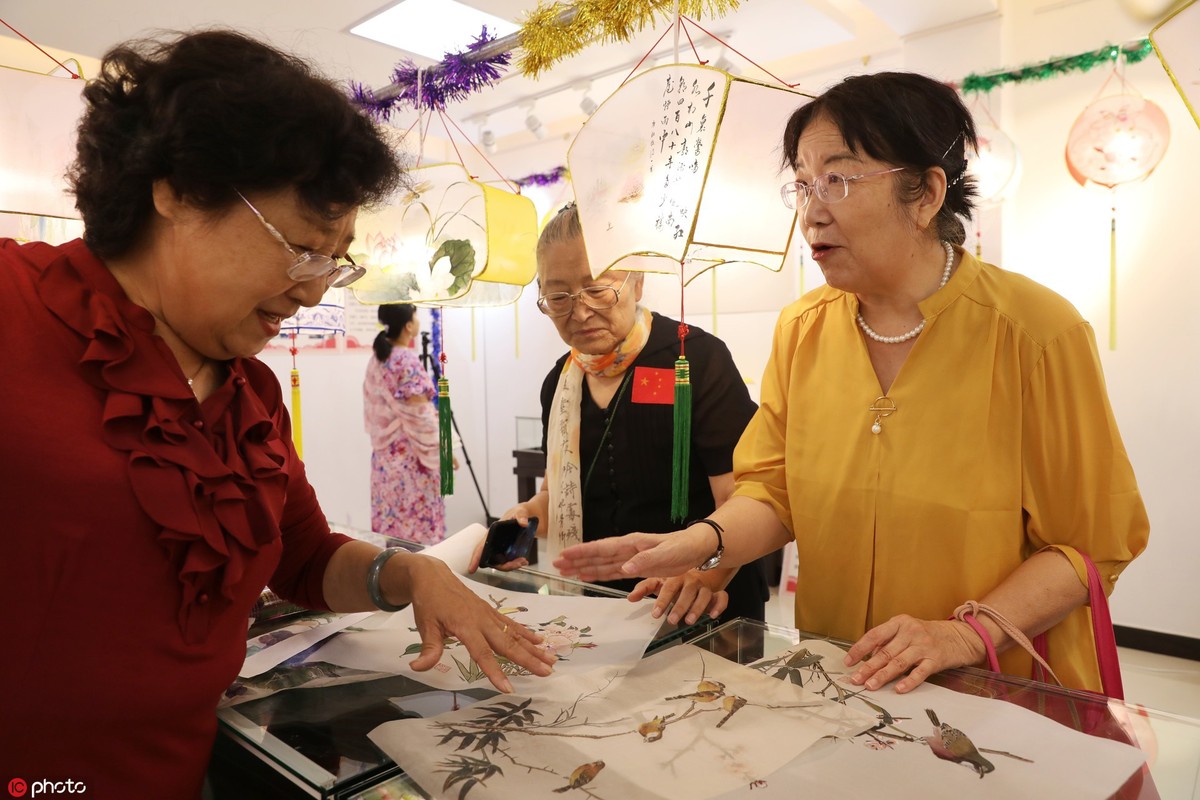 Lantern-makers talk about traditional Chinese lanterns at a traditional Chinese lantern exhibition in the Yayuncun subdistrict cultural center, Chaoyang district, in Beijing, on Sept 24, 2019. [Photo/IC]