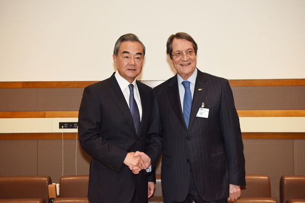 During a meeting on the sidelines of the UN General Assembly high-level week, Wang said that leaders from China and Cyprus have reached important consensus on promoting bilateral ties and designated directions for future development of the relationship during the Second Belt and Road Forum for International Cooperation this April.