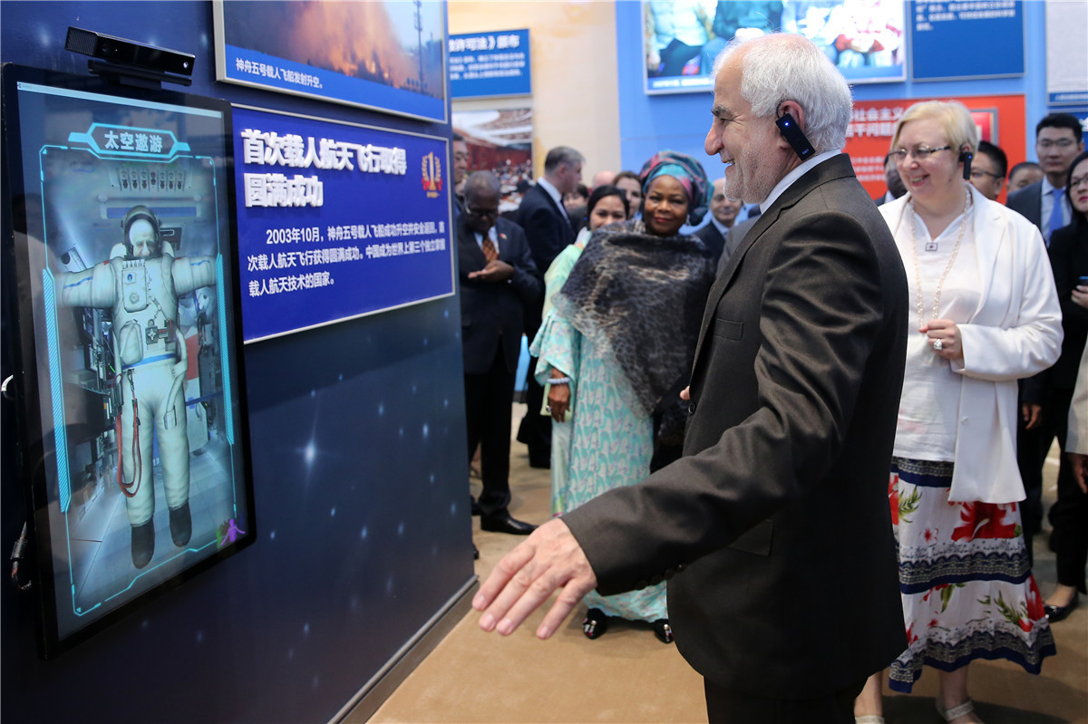 Foreign diplomats visit an exhibition marking the PRC's 70th anniversary at the Beijing Exhibition Center on Sept 25, 2019. [Photo by Wang Zhuangfei/China Daily]