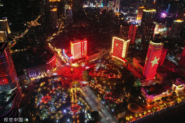 A light show is presented on the facades of 24 high-rise buildings along the northern bank of the Pearl River in Guangzhou, South China's Guangdong province, to celebrate the 70th anniversary of the founding of the People's Republic of China, Sept 25, 2019. [Photo/VCG]