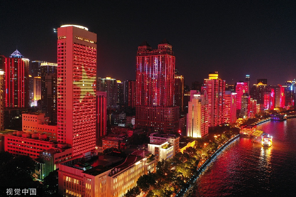 Lights project images of Chinese national flags on the facades of 24 high-rise buildings along the northern bank of the Pearl River in Guangzhou, South China's Guangdong province, to celebrate the 70th anniversary of the founding of the People's Republic of China, Sept 25, 2019. [Photo/VCG]