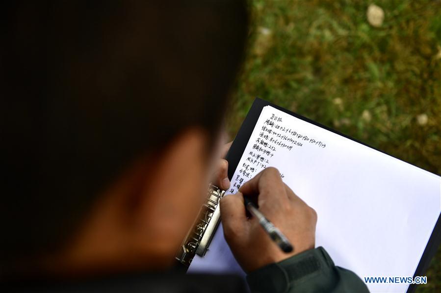 Jia Jinxiao, an observer of the Qinghai Lake National Nature Reserve Administration Bureau, notes observation records by the Qinghai Lake in Northwest China's Qinghai province, Sept 23, 2019. A three-day autumn observation around the Qinghai Lake by the observers of the Qinghai Lake National Nature Reserve Administration Bureau has concluded after the last observation at Daotanghe wetland. Observers studied and analyzed the ecological environment conditions of Qinghai Lake through collecting the records of wetlands and birds of about 20 observation spots along the Qinghai Lake. [Photo/Xinhua]