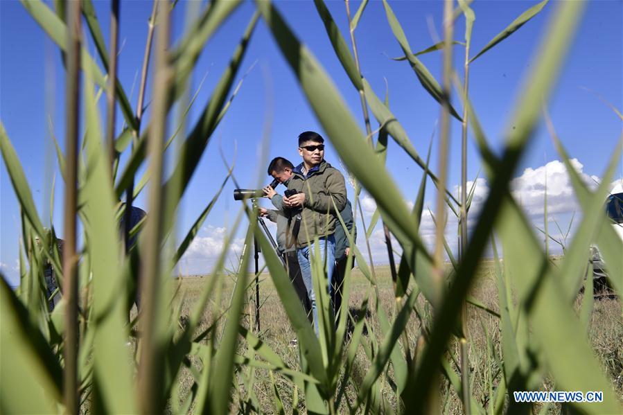 Qu Yongqiang (R) and Wang Yanming, observers of the Qinghai Lake National Nature Reserve Administration Bureau, observe at the river mouth of Buha river in Northwest China's Qinghai province, Sept 24, 2019. A three-day autumn observation around the Qinghai Lake by the observers of the Qinghai Lake National Nature Reserve Administration Bureau has concluded after the last observation at Daotanghe wetland. Observers studied and analyzed the ecological environment conditions of Qinghai Lake through collecting the records of wetlands and birds of about 20 observation spots along the Qinghai Lake. [Photo/Xinhua]