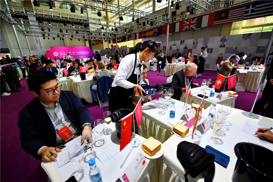 Judges from around the world select wines during the 2019 Belt and Road International Wine and Spirit Competition in Yinchuan, Ningxia Hui autonomous region. [Photo by Su Yong/for chinadaily.com.cn]