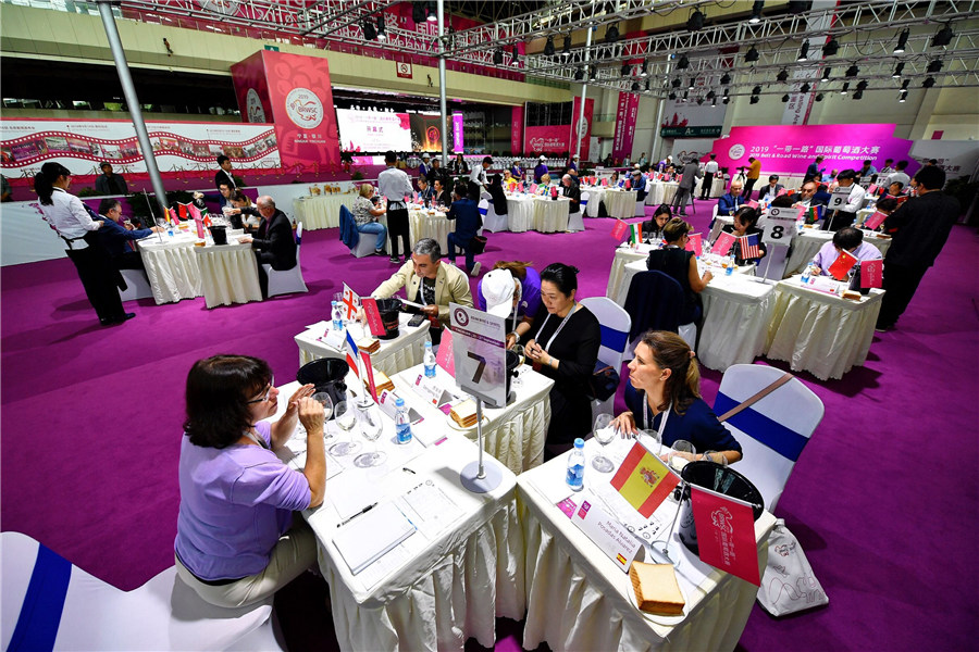 Judges from around the world select wines during the 2019 Belt and Road International Wine and Spirit Competition in Yinchuan, Ningxia Hui autonomous region. [Photo by Su Yong/for chinadaily.com.cn]