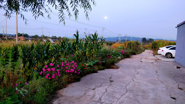 Moon nears moonset around dawn during Mid-Autumn Festival in the Yanluo village, Bulaotun, Miyun.[Photo by Siva Sankar/China Daily]
