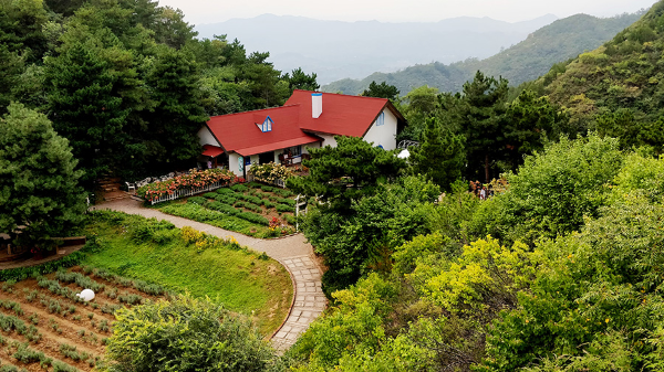 The mountaintop café at the Yunfeng scenic spot near Bulaotun, Miyun. Lavender-based products like fragrances, incense, soap, shampoo, decoratives, cakes, cookies and even ice-cream abound here.[Photo by Siva Sankar/China Daily]