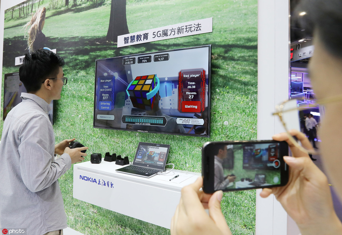 A man takes a photo of a visitor experiencing new ways to play Rubik's cube equipped by 5G technology at the International Exhibition Center in Zhengzhou, Central China's Henan province, on Sept 25, 2019. [Photo/IC]