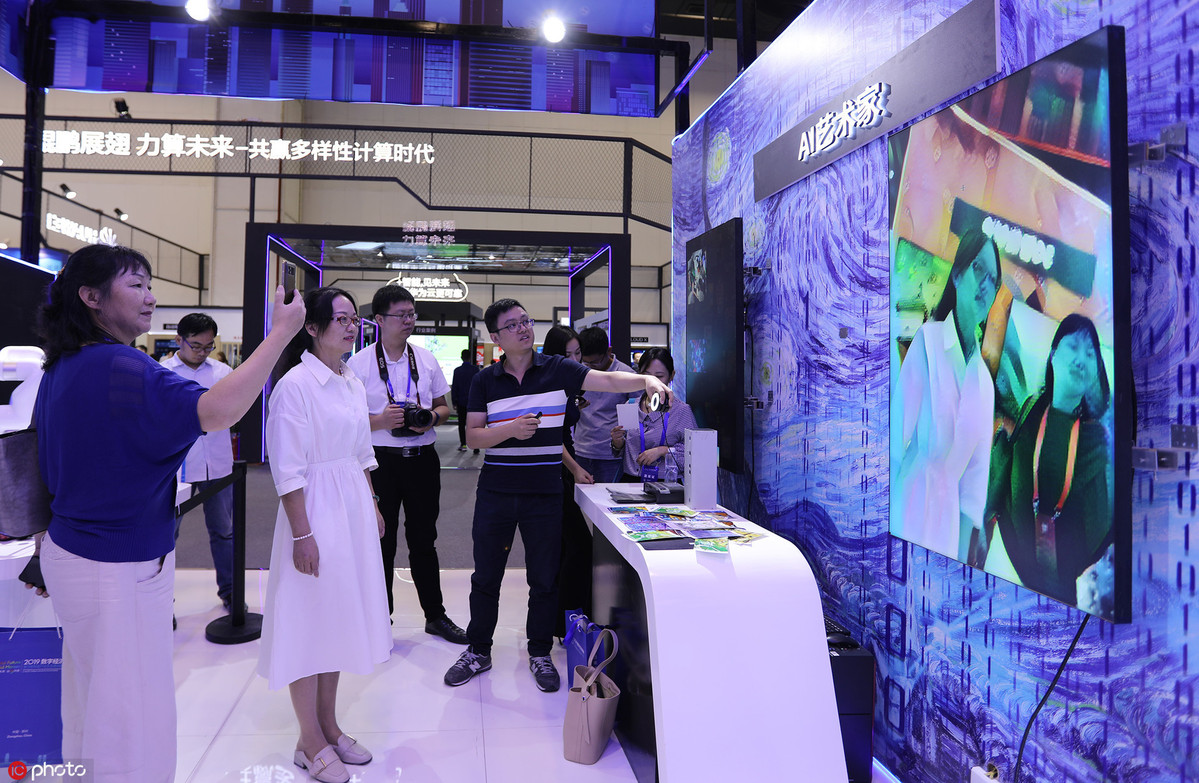 An artist draws a picture with the aid of AI technology at the International Exhibition Center in Zhengzhou, Central China's Henan province, on Sept 25, 2019. [Photo/IC]