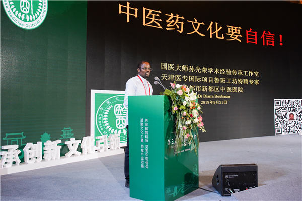 A foreign delegate delivers a speech during the third Chinese Medicine Cultural Congress in Neiqiu county, Xingtai city, Hebei province, Sept 22, 2019. [Photo provided to chinadaily.com.cn]