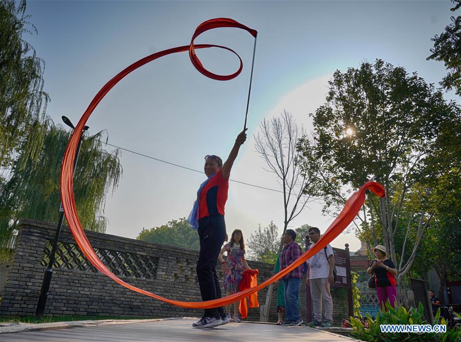 A woman performs ribbon dance at Sanlihe Park in Qianmen area of Beijing, capital of China, Sept. 28, 2019. Nearly 60 journalists, who came to cover events for the celebration of the 70th founding anniversary of the People's Republic of China, were invited to visit Qianmen area to experience the life of local people. (Xinhua/Cai Yang)