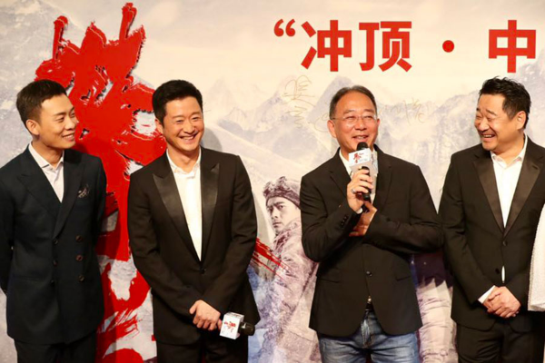 Producer Ren Zhonglun (second from right) and leading actors Wu Jing(third from right), Zhang Yi (left) and Wang Jingchun attended the celebrations. [Photo by Zhu Xingxin/chinadaily.com.cn]