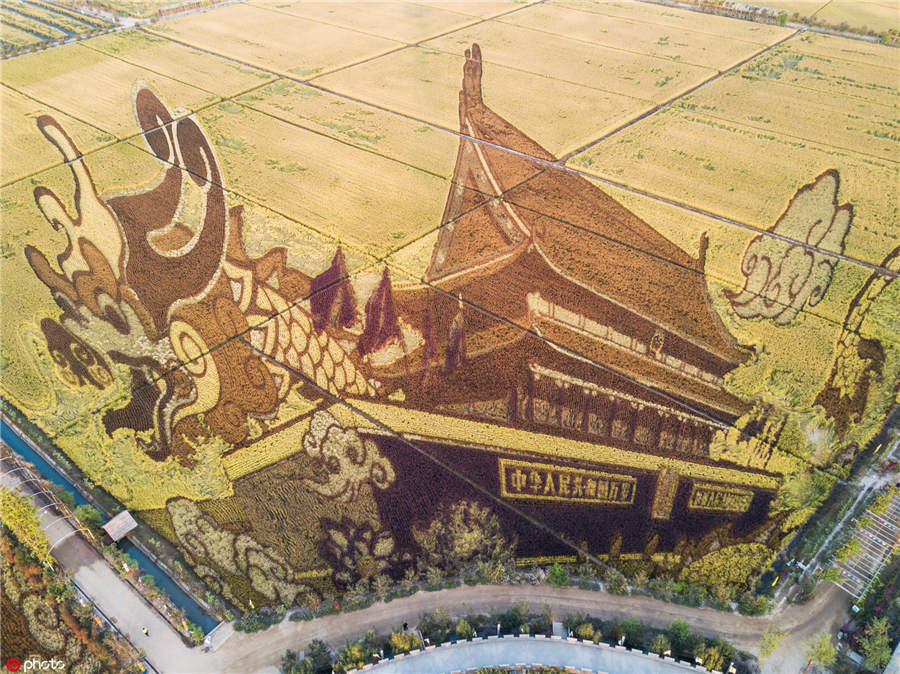 3D art created in a paddy field celebrates the 70th anniversary of the founding of the People's Republic of China in Shenyang city, Northeast China's Liaoning province. The large paddy field paintings are composed of nine-colored rice, and occupy an area of 10 hectares.