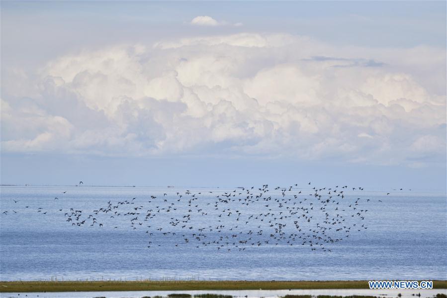A flock of birds fly over the Qinghai Lake in Northwest China's Qinghai province, Sept 23, 2019. The ecological environment of Qinghai Lake area has improved gradually in recent years, owing to the increasing rainfalls and a series of ecological restoration programs.[Photo/Xinhua]