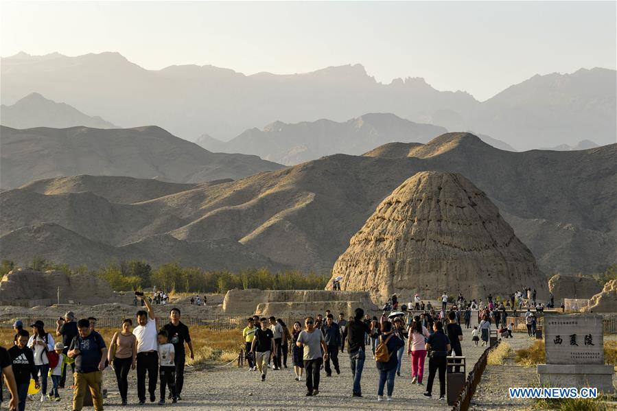 Tourists visit the imperial tombs dating back to the Western Xia Dynasty (1032-1227) in Yinchuan, capital of Northwest China's Ningxia Hui autonomous region, Oct 2, 2019, the second day of the 7-day-long National Day holiday. [Photo/Xinhua]