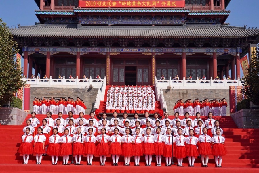 Children chorus during the opening ceremony of the cultural week to worship the legendary ancestor Huangdi, or the Yellow Emperor, in Qian'an, North China's Hebei province, Oct 7, 2019.[Photo/Xinhua]