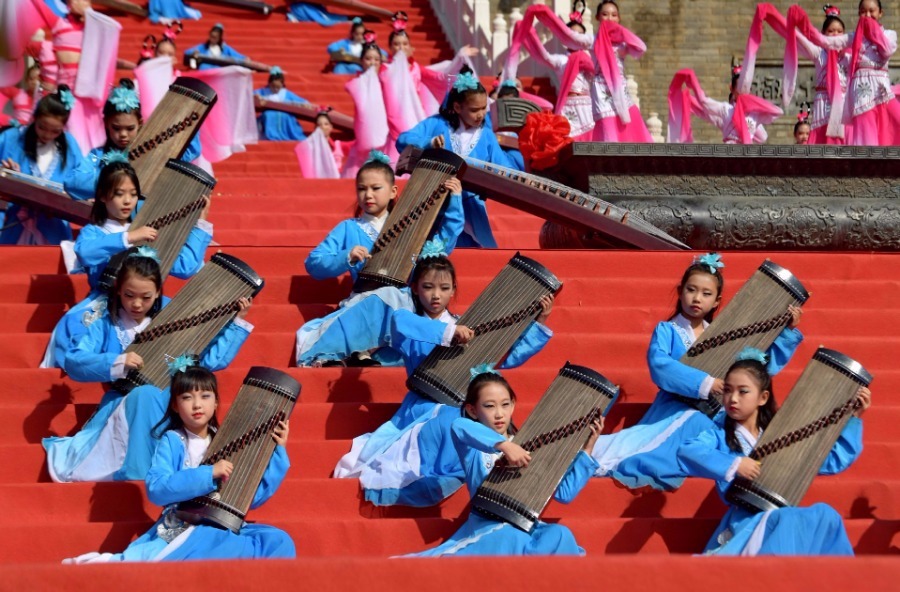 Children perform during the opening ceremony of the cultural week to worship the legendary ancestor Huangdi, or the Yellow Emperor, in Qian'an, North China's Hebei province, Oct 7, 2019.[Photo/Xinhua]