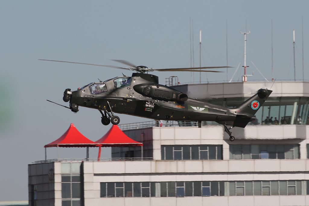 A Z-10 armed helicopter flies at China Helicopter Expo 2019 on Oct 8, 2019. [Photo/VCG]