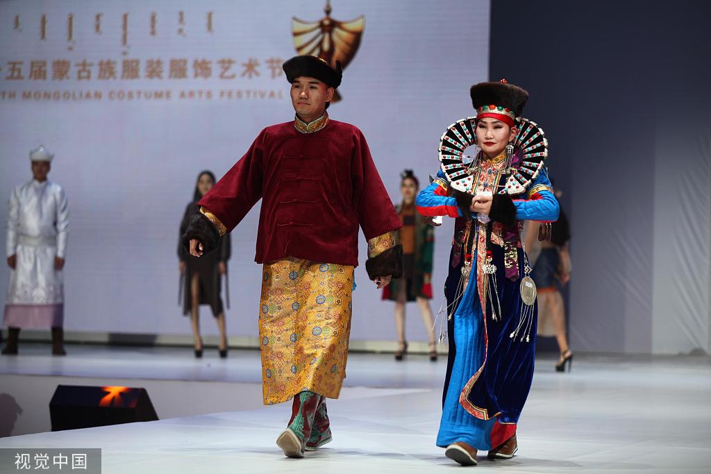 Like most of other Mongolian tribes, men and women have different routines for wearing their waistbands: men tie their waistbands around hips then lift their robes; women tie their girdles around waists to show off the figures. Women usually separate their hair into two braids before wearing headgear. Apart from head hoops, brides wear several golden and silver hairpins at weddings while grooms wear round hats with a standing brim and a mink tail. Both men and women wrap their heads with long hairbands in the color of white or light blue. As a symbol of marital status, married women wear long waistcoats when attending important occasions, but this dress code doesn’t apply to girls.