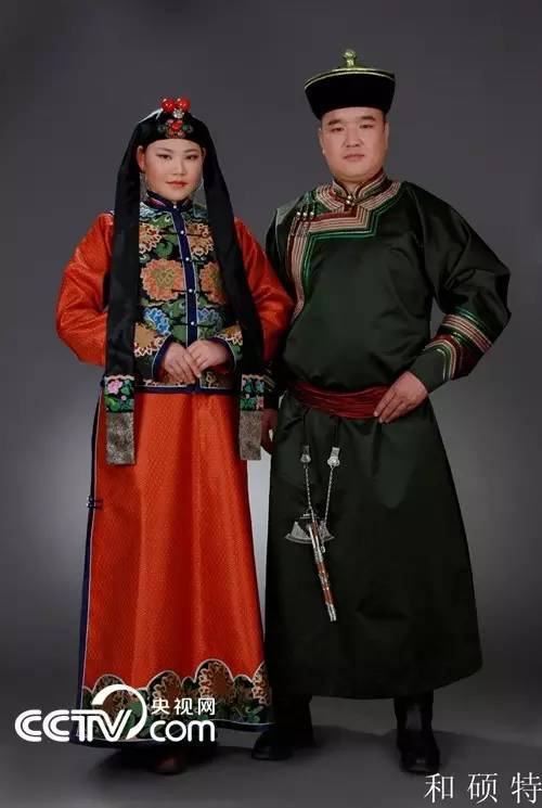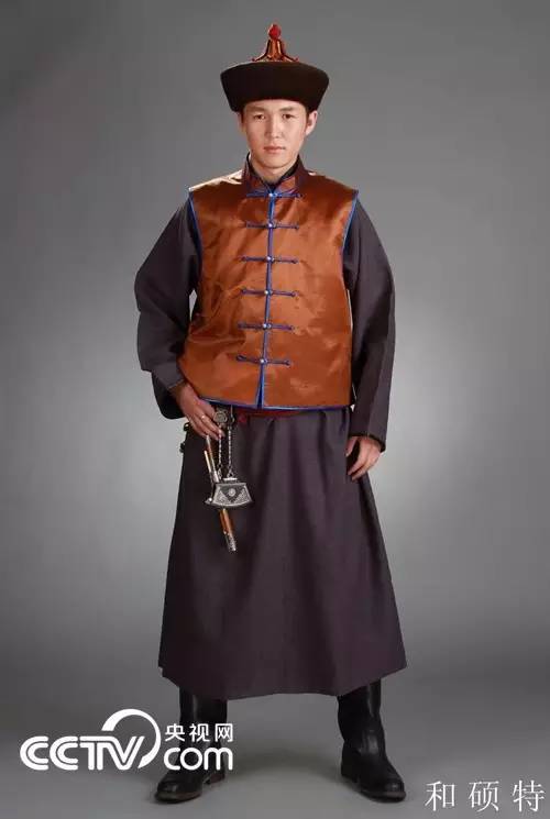 Waistcoats are ceremonial clothing for everyone except unmarried girls. Like many other Mongolian tribes, men and women have different routines for wearing their waistbands: men tie their waistbands, matched with embroidered pouches, snuff bottles and silver toothsticks, around hips then lift their robes; women tie their girdles around their waists without lifting the robes. When wearing headgear, women usually put two braids into hair sleeves hanging on both sides.