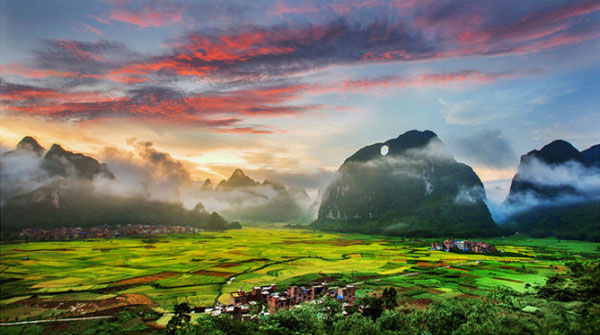 Mei Li Shen Qi De Yue Liang Shan (Beautiful and Miraculous Moon Mountain), wins second prize in the natural scenery category of the contest. It shows the magnificent mountain views in Huanjiang Maonan autonomous county, Hechi. [Photo by Yuan Gang/Hechi Daily]