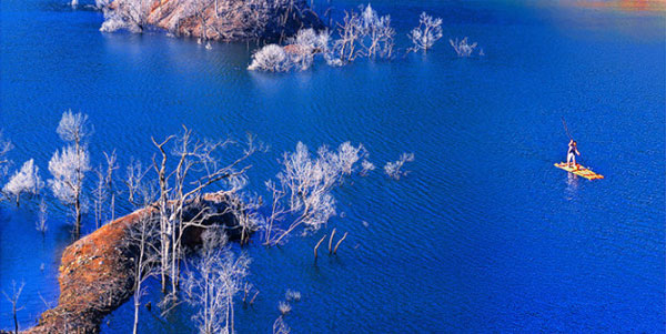 Islets, withered trees covered with white snow, shining sunshine, and a puny primitive boat form a harmonious scene, which wins honorable mention in the natural scenery category of the contest. [Photo by Yu Fei/Hechi Daily]