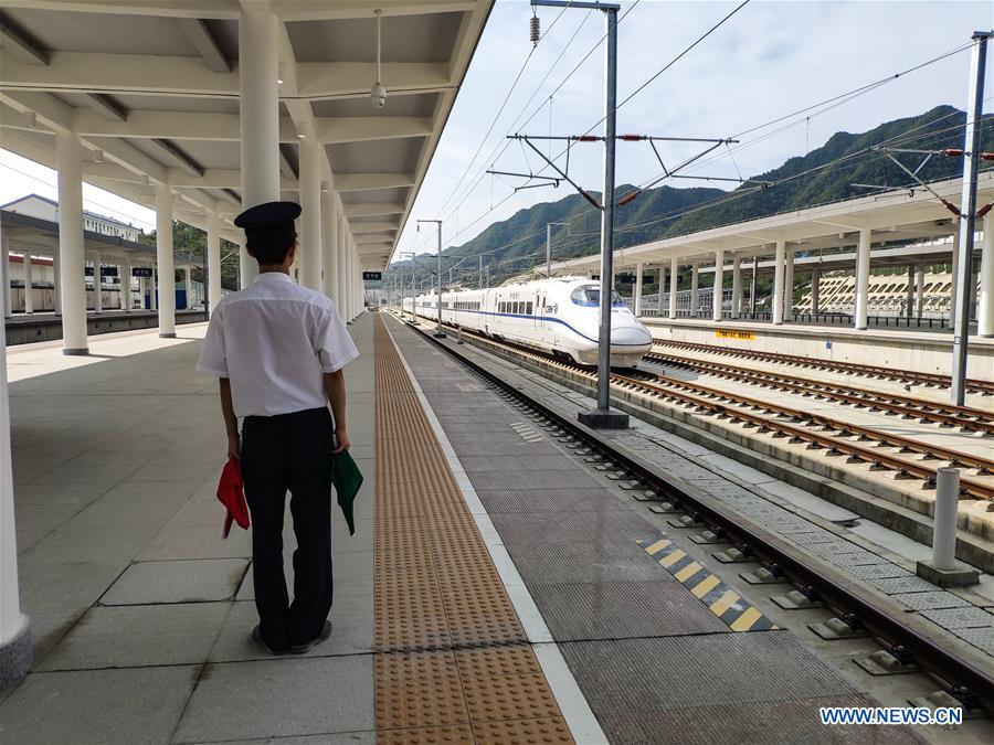 A bullet train passes Bijie Railway Station during a test run on the Xingwen-Guiyang section of the Chengdu-Guiyang railway in Southwest China's Guizhou province, Oct 9, 2019. The 632-kilometer Chengdu-Guiyang railway is a key constituent of China's high-speed railway network, linking the capital of Sichuan province and the capital of Guizhou province with a design speed of 250 kilometers per hour. Sections of the railway in Sichuan are already in use, while the whole line will be in operation by the end of this year. [Photo/Xinhua]