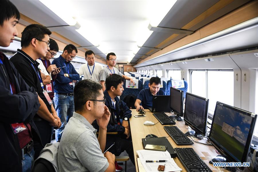 Staff members work aboard a bullet train during a test run on the Xingwen-Guiyang section of the Chengdu-Guiyang railway in Southwest China, Oct 9, 2019. The 632-kilometer Chengdu-Guiyang railway is a key constituent of China's high-speed railway network, linking the capital of Sichuan province and the capital of Guizhou province with a design speed of 250 kilometers per hour. Sections of the railway in Sichuan are already in use, while the whole line will be in operation by the end of this year. [Photo/Xinhua]